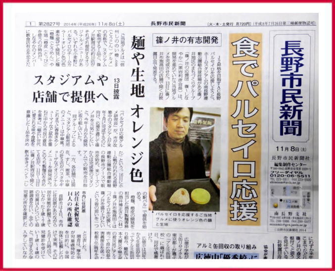 メディア・掲載情報 2014.11.08【掲載情報】長野市民新聞AC長野パルセイロ応援 しののい橙.conグルメ 『橙麺&橙皮』を取り上げていただきました。 【掲載情報】ながの情報FREE前の記事 【掲載情報】信濃毎日新聞次の記事