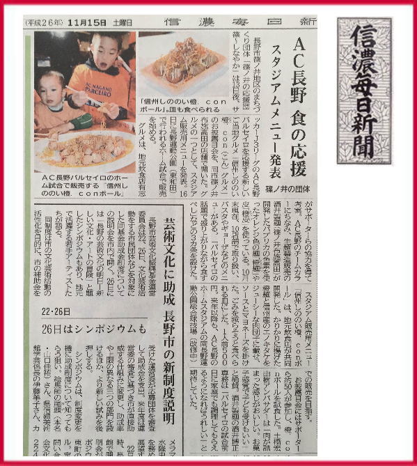 メディア・掲載情報 2014.11.15【掲載情報】信濃毎日新聞しののい橙.conグルメ「橙.conボール」プレスリリースを取り上げていただきました。 【掲載情報】長野市民新聞前の記事 【掲載情報】長野市民新聞次の記事